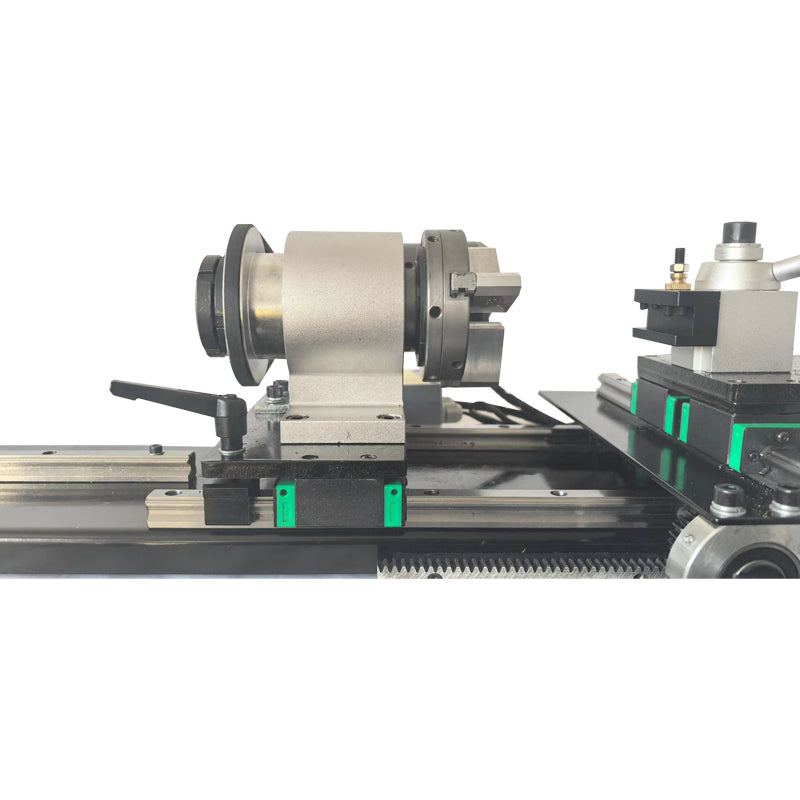 【スピンドル】:ビリヤードキュー旋盤のスピンドル貫通穴は32mmで、高精度の手締めチャックを採用し、精度は0.001~0.002インチです。安定性と高精度を兼ね備えたダブルテールドラグベアリングシート設計を採用しています。スピンドルシート、ミドルドラグプレート、テールシートは、ガイドレール上で左右に一定の範囲内で移動できます。